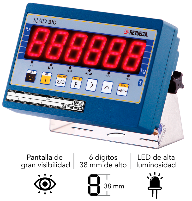 Pantalla de gran visibilidad, 6 dígitos de 38 mm de alto, LED de alta luminosidad.