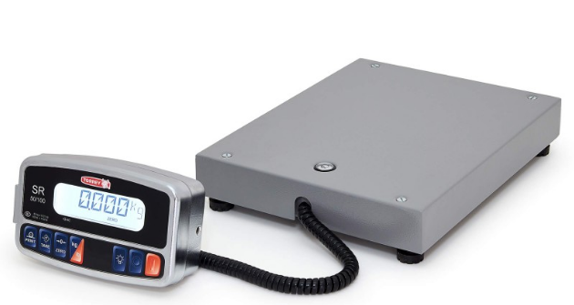 Báscula de tamaño práctico y compacto con diseño robusto, ideal para recibo de paquetería, mensajería y mercancía en bodegas.