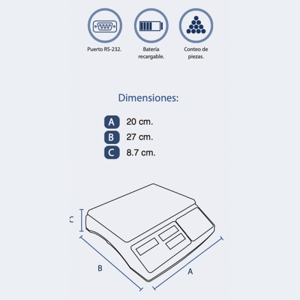 - Dimensión de la superficie de pesaje: 31.5 x 22.5 cm.