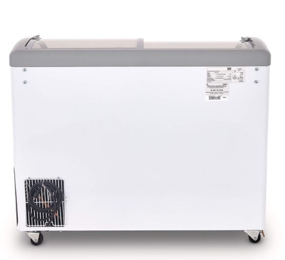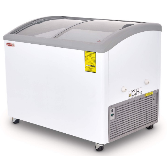 - Congelador horizontal con tapas deslizables de cristal curvo con cerradura de 11 pies3 de capacidad y refrigerante ecológico de HC
