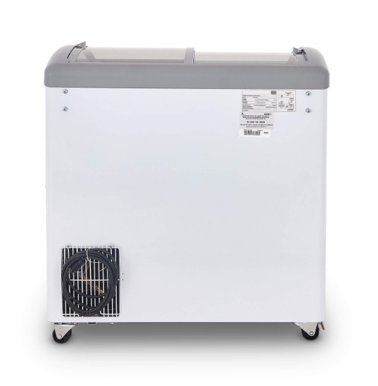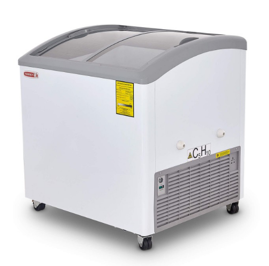 - Congelador horizontal con tapas deslizables de cristal curvo con cerradura de 8 pies3 de capacidad y refrigerante ecológico de HC