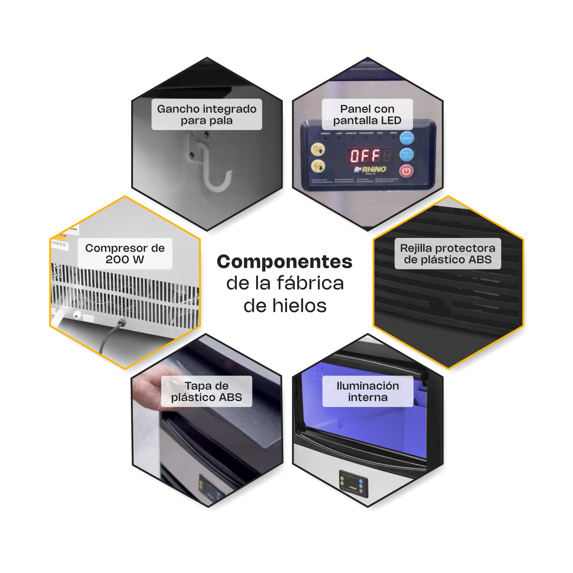 - Capacidad de producción diaria: 40 kg (temperatura ambiente 10°C / Agua 10° C) y 39 kg (temperatura ambiente 20°C/ Agua 10°C)